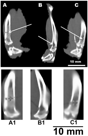 CT image of a rat tibia defect. (A,A1)—channel with a sample; (B,B1)—channel without sample (positive control); (C,C1)—intact bone. White arrows indicate bone defects (A,B) or intact intramedullary canal (C).