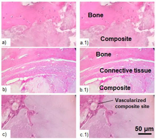 Histologic study of the bone tissue with the introduced composite after hematoxylin-eosin staining. (a,a.1)—proliferation of osteocytes in the area of the bone defect; (b,b.1)—connective tissue in the area of defect between the composite and the bone; (c,c.1)—vascularization of the composite in the area of defect.