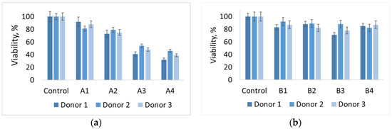Histogram of the viability level of human macrophages in the presence of materials (а) A1–A4 and (b) B1-B4, respectively.