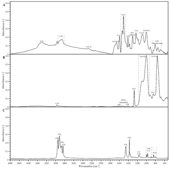 FT-IR spectra for studied materials: (A) polyurethane foam (PUF), (B) methyltrimethoxysilane (MTMS) aerogel and (C) polypropylene (PP) fibers.