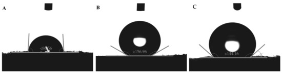 Results of goniometrical analysis of wettability of PUF, MTMS aerogel and PP fibers are presented in Figure 2. In the case of PUF (Figure 2A), it is on the edge of hydro-phobicity/philicity with contact angle ca. 90°. Methyl groups present on the surface of MTMS aerogel lead to its high hydrophobicity, with water/air contact angle ca. 157° (Figure 2B). It is worth mentioning that the standard deviation of measurements performed for PUF indicates less regular surface structure, compared to MTMS aerogel. PP fibers (Figure 2C) also show a high contact angle of about 144° due to the presence of -CH3 groups and the fibrous structure which leads to a low wetted surface fraction. Similar to PUF, high standard deviation value was caused by chaotic structure of fibrous material.