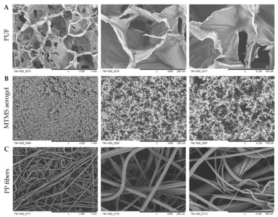 SEM micrographs of basic materials: (A) PUF, (B) MTMS aerogel and (C) PP fibers.