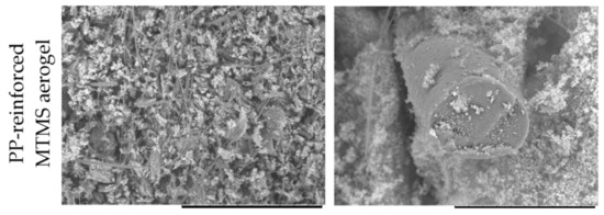 Figure 4 shows SEM micrographs of PP-reinforced MTMS aerogel cross-section. Although the aerogel structure was shuttered during cutting, one can observe that organosilica is uniformly distributed in the fibrous material volume. Thanks to the precondensation soaking of the PP fibers in isopropanol, the reagents gain access to the fiber surface, which leads to better integrity with MTMS aerogel.