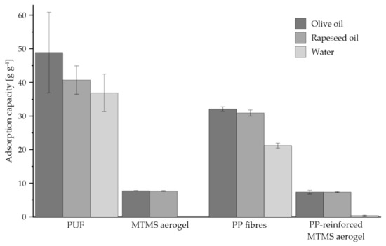 The values of adsorption capacity for PUF, MTMS aerogel, PP fibers and PP-reinforced MTMS aerogel exhibited toward olive and rapeseed oils, as well as water.