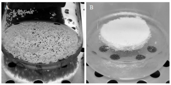 In the case of the present studies, the constructs made of PUF and MTMS aerogel were prepared as circular, monolithic plates/platforms, to offer a solid and flat surface which roots can inoculate, and further grow, with free access to both phases of air and aqueous culture medium (Figure 6A). Moreover, such forms of applied monolithic constructs should protect biomass from mechanical damage, as well as from negative effects of hydrodynamical shear stress caused by mixing. However, not every material tested in the current study remained monolithic during the whole culturing time. MTMS aerogel while applied as pure, i.e., nonreinforced with PP fibers, the material was fragile and easily disintegrated into small, i.e., 3–5 mm diameter, elements freely floating on the surface of culture medium (Figure 6B). The disintegration was caused by even mild agitation.