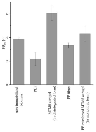 Based on data presented in Figure 7, it can be concluded that naphthoquinones were accumulated in all tested constructs, i.e., PUF, MTMS aerogel and PP-reinforced MTMS aerogel. Such effects resulted from high sorption capacity of PUF and MTMS exhibited toward organic compounds (Figure 5). PUF and monolithic MTMS constructs adsorbed over 90% of total naphthoquinones produced in the respective culture systems. MTMS aerogel applied in disintegrated form adsorbed only 76% of naphthoquinones fraction. Higher standard deviation values noted for both systems supported with MTMS aerogel, probably resulted from limited extraction of naphthoquinones from nanopores of MTMS aerogel (Figure 3).