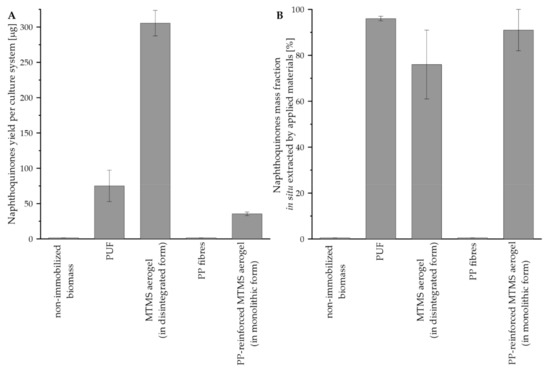 The values of naphthoquinones yield per culture system and the naphthoquinones mass fraction adsorbed on materials is presented in Figure 8. In the case of the reference, i.e., nonimmobilized, culture and the control culture performed on PP fibers, the level of naphthoquinones remained under the detection threshold. The highest value of naphthoquinones yield per culture system was noted for culture system supported with disintegrated MTMS aerogel (i.e., 305.4 µg), and such value was over four times higher than noted for system supported with PUF (i.e., 75.1 µg), as well as over eight times higher than the level reported for the system with PP-reinforced MTMS aerogel (i.e., 35.5 µg) (Figure 8A). In the case of naphthoquinones, the mass fraction in situ extracted by applied materials, the highest value of such parameter was detected for PUF-supported culture (i.e., 96%). The lowest value of the mass fraction was observed for culture systems supported with MTMS aerogel applied in disintegrated form (i.e., 76%) (Figure 8B).