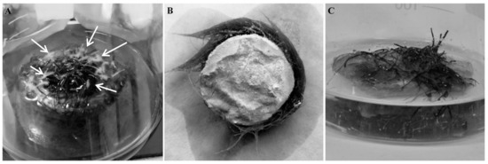 Morphology of Rindera graeca hairy roots proliferated on tested constructs made of monolithic PP-reinforced MTMS aerogel: (A) view from above with newly formed root hairs marked with white arrows, (B) bottom view; and PUF: (C) view from above.