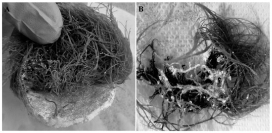 While placed on the monolithic materials, hairy roots spread and covered only the top surface of the construct, until reaching its edge. Then, the roots elongated into aqueous culture medium (Figure 9A,B). It means that biomass was mechanically protected as long as it grew only on the surface of construct. Longer roots were exposed to negative effects that originated from hydrodynamics and mechanical agitation of the culture system. Finally, this resulted in hairy root collisions with the culture vessel walls leading to mechanical destruction of long hairy roots.