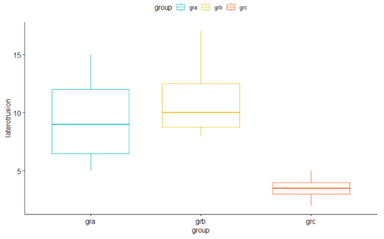 Statistically significant are the differences between laterotrusion to the unoperated side (Figure 2, Kruskal–Wallis chi-squared = 9.5038, df = 2, p = 0.008635). The differences between group A and C and B and C are significant, and there is no significant difference between group A and B (Dunn post hoc—Table 4). It means that the clinical application of TMJ TJR was associated with significant limitation of laterotrusion to unoperated side.