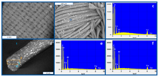 Two scanning electronic microscope (SEM) images of Test Sample 1 (a,b). (c) A representative Energy Dispersive X-ray Analysis (EDX) of a white dot (circled in (b)). (d) Cross section image of a single fiber showing the cuprous oxide microparticles throughout the fiber. (e) EDX analysis of the single-circled white dot shown in (c). (f) EDX analysis of the square area shown in (c). All EDX analyses show a peak at 8 keV corresponding to copper.