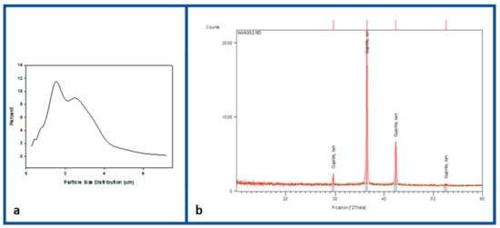 Particle size distribution (a) and X-ray diffraction (XRD) analysis (b) of the cuprous oxide microparticles.