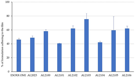 The formulations that better attached to the mucin film after 90° inclination of the device are AL2100, AL2102, AL2103, AL2105, and AL2106, which showed an adherence of more than 50% of the applied formulation.