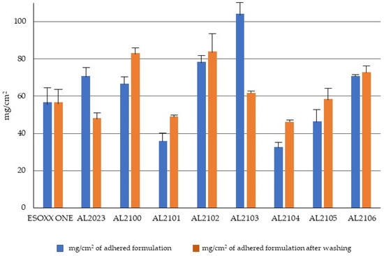 After the washing of the formulations in water and the subsequent tilting, some formulations maintained the exact same weight, which indicates that they are able to resist to the washing effect (Esoxx One, AL2102, and AL2106). Some other formulations lose some of their weight after washing (AL2023 and AL2103), indicating that they cannot offer sufficient resistance toward the washing action. Finally, formulations AL2100, AL2101, AL2104, and AL 2105 gained weight after washing; since this phenomenon was due to the formulations’ ability to absorb water, this result must be considered to be negative: by absorbing too much water, these formulations could, in fact, even absorb the gastric reflux.
