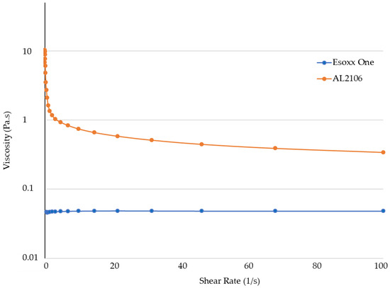 Flow curves (viscosity) of Esoxx One and AL2106 formulations.
