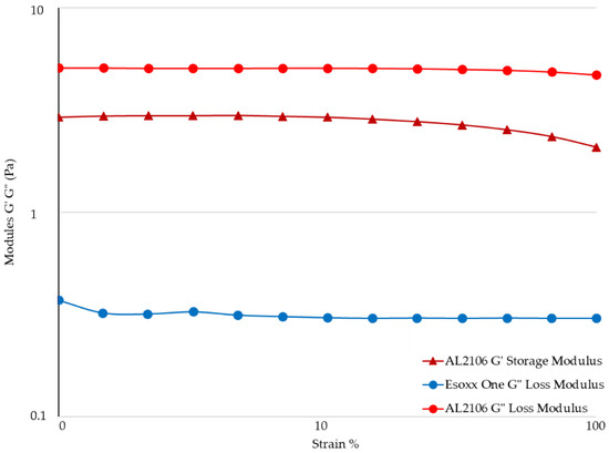 Amplitude Sweep of Esoxx One and AL2106 formulations. G′ and G″ are the elastic and viscous moduli, respectively. The G′ storage modulus for Esoxx One was not measurable.