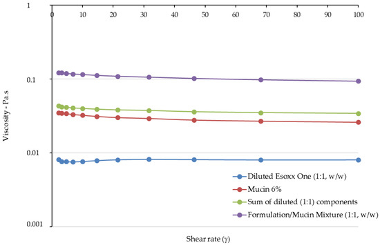 Therefore, the flow test was used to check whether there was any interaction between the test formulations and mucin by comparing the viscosity profiles of a 1:1 formulation/mucin mixture with those of the individual components at the same concentration they would have in the mixture.