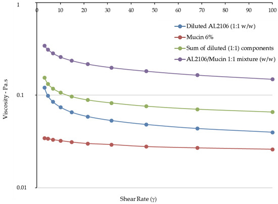 Viscosity of the AL2106 formulation, pure mucin, the sum of the formulation/mucin viscosities, and the viscosity of AL2106/mucin 1:1 (w/w) mixture.