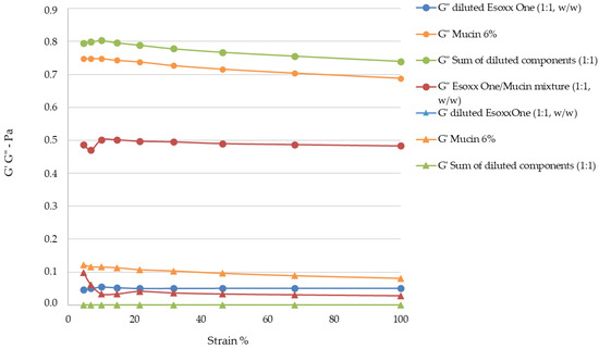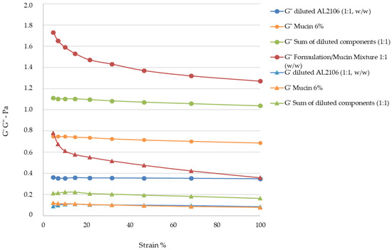 In the Amplitude Sweep technique, a rheological interaction between the tested formulation and mucin can be demonstrated if G′ and G″ values of their mixture are greater than the sum of single G′ and G″ values of each component (diluted formulation and diluted mucin). Such an effect indicates a rheological synergism and can be calculated as follows:
