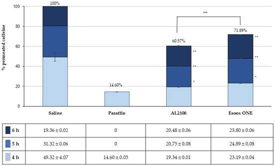 Diffusion of caffeine in the basolateral receptor fluid after 4, 5, and 6 h from the application of the test formulations, expressed as the percentage of the caffeine amount (mean ± S.D. of six replicates) found after the application of saline (negative control). Statistical significance was set at * p < 0.005 and ** p < 0.0005 vs. saline, and *** p < 0.00005 for AL2106 vs. Esoxx One).