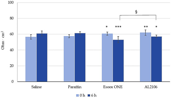 Figure 11 shows the TEER results expressed in Ohm cm2 before application (T = 0 h) and after 6 h of treatment (T = 6 h). TEER was assessed to evaluate the influence of the products on the paracellular flow at the level of the epithelial mucosa. The values before the treatments, ranging from 57 to 62 Ohm cm2, correspond to the barrier function associated with both the integrity of the tight joints and the tissue thickness. TEER values recorded after 6 h of treatment with paraffin (positive control) were not different from the negative control (saline) (+7% vs. the TEER measured at T = 0). A slight, although statistically significant, reduction of 8% and 13% was registered after 6 h of treatment with AL2106 and Esoxx One, respectively. After 6 h, AL2106 gave a significant difference (t-test, p < 0.1) vs. Esoxx One (conversely, the difference measured at 0 h was not statistically significant).