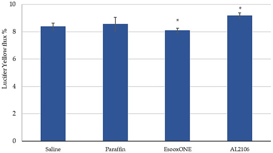 Flow of Lucifer Yellow (mean ± S.D.) after 6 h of treatment followed by washing of the products. Each analysis was carried out on three samples for each batch in triplicate (n = 9) (* p < 0.005 for both batches vs. saline and for AL2106 vs. Esoxx One).