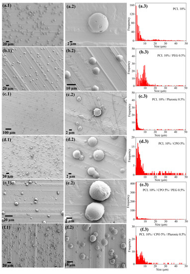 w/v) or Pluronic (0.5%) as stabilizer were prepared in DCM and stirred for 1 h. The working temperature was 18 ± 1 °C, and the relative humidity was controlled in the range of 50–60%. To synthesize OMPs with different CPO concentrations and different stabilizing agents, polymer solutions containing 10% PCL, with CPO at 0, 0.5, 1, 2, and 5% (