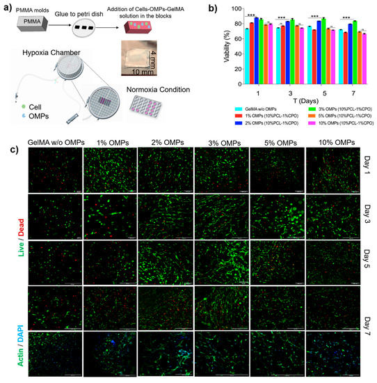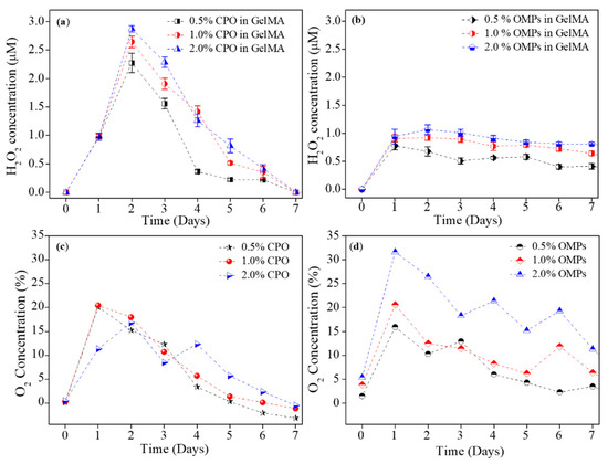 Figure 5a) showed good viability for the different concentrations of the OMPs co-encapsulated within these hydrogels together with the cells. CPO encapsulation in the hydrophobic polymer, PCL, extended oxygen release times and lowered the toxicity of the CPO (