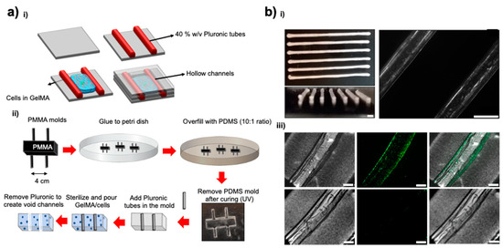 Figure 4a shows the basic principle and fabrication steps for a microfluidic chip consisting of a hollow vessel and a respective custom-designed PDMS microfluidic device. A PF-127 channel as a sacrificial channel can be dissolved to fabricate a hollow space within a GelMA hydrogel containing construct as shown in