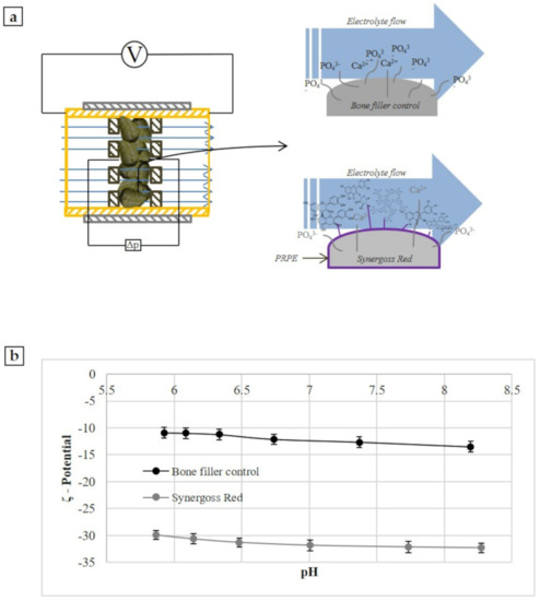 Figure 1. ζ-Potential measurements of Synergoss Red and Bone filler Control. (a) Graphical images of the principle of ζ-potential measurement for solid surfaces; (b) pH scan curve from 8.5 to 5.5.
