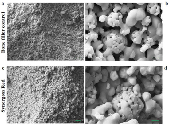 Morphology and surface area play an important role in the interaction of bone cells with biomaterial surfaces. Micro-/macrosurface pores and roughness promote mechanical interlocking and bone ingrowth, influence the tissue response, and increase the fixation and stability of the implant. Figure 2a,b show SEM images of the surface of granules of the bone filler control, whereas Figure 2c,d show Synergoss Red, at different magnifications (a–c: 1000×; b–d: 15,000×).