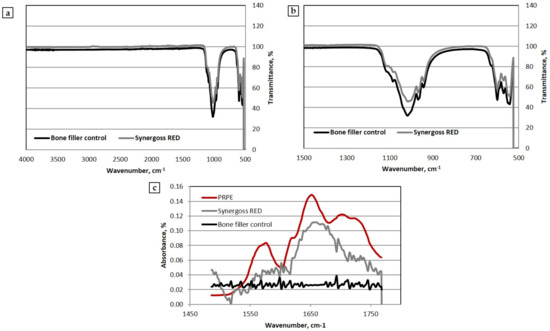 Both the untreated (BF) and the PRPE-treated (SR) ceramic bone fillers were analyzed in order to provide information related to the chemical composition and main functional groups of the material. In Figure 3a, the spectra of the bone fillers with and without PRPE functionalization are reported (from 500 cm−1 and 4000 cm−1). Figure 3b shows a focus on the peaks related to the inorganic phase (1500–500 cm−1), with a clear calcium phosphate composition of Synergoss Red. Both the bone fillers showed typical bands associated with the triply degenerated asymmetric stretching mode of P-O bonds of phosphate groups in the range between 950 and 1140 cm−1 [3]. The peak at 1125 cm−1 is due to tricalcium phosphate, while peaks at 1025 cm−1 and 1010 cm−1 are typically associated with HA, overlapped with the component due to β-TCP [3,48]. Interesting results were obtained comparing the Synergoss Red material with the bone filler control and PRPE from lyophilized Croatina extracts used for the treatment of the bone filler (Figure 3c).