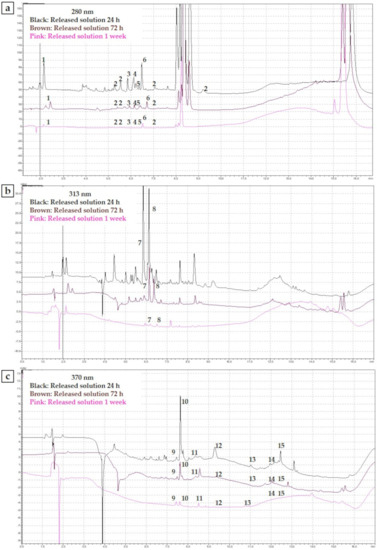 The Pph release study was performed by using the Folin-Ciocalteu method to quantify the phenolic content in the release media and using the DPPH assay to quantify the antioxidant power; experimental details are described in the sections Phenolic content of PRPE and Antioxidant power of PRPE. The HPLC analysis was performed on the released solution according to the method described in section UHPLC analysis. Three specimens for each sample were immersed in ultrapure water (1 mL of dH2O for 0.2 g of SR) at 37 °C for 24 h, 72 h, and 1 week. At each time point, the release solution was removed and replaced with the same amount of fresh solution. A 0.2 g measure of Synergoss Red incorporates around 0.951 mg of polyphenols, which could be considered the initial amount of molecules.
