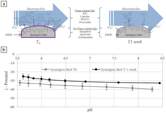 This parameter is an indirect measure of the surface charge and therefore, of the chemical groups present on a surface, and is obtained by flowing an aqueous solution with known ionic strength in the capillary channel through the ceramic granules. In Figure 1b, the pH scan curves for the material functionalized with PRPE (Synergoss Red) and for the control material without polyphenols (bone filler control) are shown.