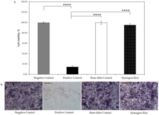 The cytocompatibility test was performed using an osteoblast-like cell line. The SaOS2 osteoblast-like cell line was used in the cell adhesion experiments. The experimental cell culture medium (BIOCHROM KG, Berlin, Germany) consisted of Minimum Eagle’s Medium without L-glutamine, 10% fetal bovine serum, streptomycin (100 g/L), penicillin 100 U/mL, and 2 mmol/L L-glutamine in a 250 mL plastic culture flask (CorningTM , Corning, NY, USA). Cells were cultured at 37 °C in a humidified incubator equilibrated with 5% CO2. Cells were harvested prior to confluence by means of a sterile trypsin-EDTA solution (0.5 g/L trypsin, 0.2 g/L EDTA in normal phosphate buffered saline, pH 7.4), re-suspended in the experimental cell culture medium, and diluted to 1 × 105 cells per mL. The quantitative test was performed in direct contact. Briefly, SaOS2 cells were seeded on SR granulate (0.2 g/well SR). Quantitative cell viability was evaluated by MTT assay after 72 h. This assay evaluates the efficiency of the mitochondrial succinate dehydrogenase (SDH) enzyme of the citric acid cycle, making it possible to identify any toxic effect due to the reduction of enzyme activity. The MTT test requires, after microscopic examination, the cells to be incubated with 1 mg/mL solution of soluble tetrazolium salt (specifically, 3-(4.5-dimethylthiazol-2yl)-2.5 diphenyl tetrazolium bromide). During the subsequent 2 h of incubation at 37 °C, the succinate dehydrogenase enzyme caused the tetrazolium salts to be transformed first into a yellow, soluble substance and then into a blue water-insoluble product, the formazan. The greater the amount of precipitate, the higher the enzyme activity and, consequently, the number of metabolically active cells. We used as negative control the cells grown on the polystyrene plate without any stimulus, and as positive control the cells grown on polystyrene, with the addition of 20 µL of a solution of 0.08 mg/mL of sodium nitroprusside (NPS), as the apoptotic compound. The precipitate was dissolved with dimethyl sulfoxide and spectrophotometrically measured at a wavelength of 570 nm, providing the optical density (OD) to be used to calculate cell viability. Results are presented as the mean ± standard deviation (SD) of 3 biological samples (n = 3).
