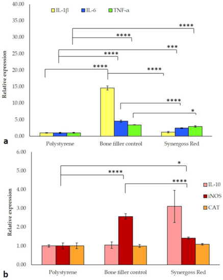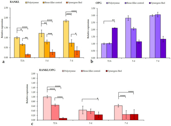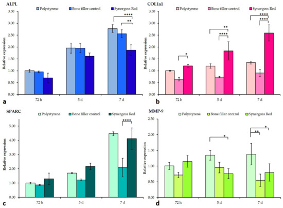 Human osteoblast-like SAOS2 cells were used in cell growth experiments. Experimental cell culture medium (BIOCHROM KG, Berlin) consisted of Minimum Eagle’s Medium without l-glutamine, 15% fetal bovine serum, streptomycin (100 μg/L), penicillin (100 U/mL), and 2 mM l-glutamine in 250 mL plastic culture flasks (Corning™, Corning, NY, USA). Cells were cultured without the addition of any osteogenic differentiation media at 37 °C in a humidified incubator equilibrated with 5% CO2. The cell suspension was obtained by adding 2 mL of a sterile 0.5% Trypsin-EDTA solution (ref 15400-054 - GIBCO by Thermo Fisher Scientific, Waltham, MA, USA), to a 250 mL cell culture flask, re-suspended in the experimental cell culture medium, and diluted to 8.5 × 104 cells/mL. Cells were seeded at the density of 8.5 × 104 cells/mL onto 12-well tissue culture polystyrene plates (Falcon® CorningTM, Corning, NY - USA) containing the Synergoss samples at the amount of 0.2 g/well. After 72 h, 5 days, and 7 days, RNA from SaOS2 cells was isolated, quantitated, and reverse-transcribed as described in the section Inflammatory and oxidative stress response.