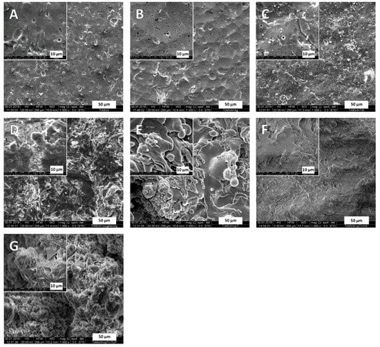 Scanning electron microphotographs of TiAl6V4 alloy and different surface modifications showing the corresponding textures. The background images were recorded with a magnification factor of 1000, and the inlays with a factor of 5000. The subfigures show the different surfaces: (A) TiAl6V4; (B) TiAl6V4 + Ag; (C) TiAl6V4 + TiN; (D) TiAl6V4 rough-blasted; (E) TiAl6V4 + cpTi; (F) TiAl6V4 + cpTi + HA; (G) TiAl6V4 + cpTi + TCP.