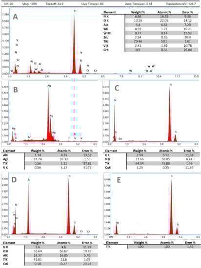 Energy-dispersive X-ray analysis results are depicted in Figure 2 for TiAl6V4, TiAl6V4 + Ag, TiAl6V4 + TiN, TiAl6V4 rough-blasted, and TiAl6V4 + cpTi.