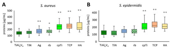Total protein concentrations of the biofilms for S. aureus (A) and S. epidermidis (B). Differences between the base material TiAl6V4 and the surface modification types have been calculated, and statistically significant differences are marked as * (adjusted significance < 0.05 according to the Bonferroni correction for the Kruskal–Wallis test) or ** (adj. sig. ≤ 0.01).