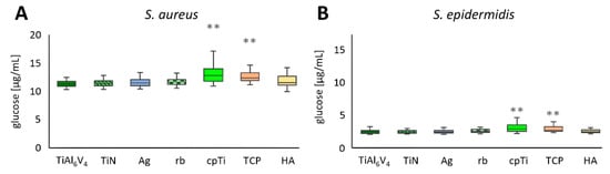 Glucose concentration of S. aureus (A) and S. epidermidis (B) biofilms on the different titanium-alloy surface modifications. Differences between the base material TiAl6V4 and the surface modification types have been calculated and statistically significant differences are marked as ** (adjusted significance < 0.01 according to the Bonferroni correction for the Kruskal–Wallis test).
