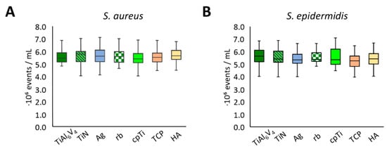 For this study, a pure TiAl6V4 base [,,] was modified by adding silver (Ag), titanium nitride (TiN), pure titanium (cpTi), cpTi with hydroxyapatite (HA), and cpTi with tricalcium phosphate (TCP) surface coatings, as well as rough-blasting (rb) the surface of TiAl6V4. Using an in vitro model, the influence of these newly developed surface modifications on S. aureus and S. epidermidis biofilm development has been studied using protein and glucose quantification assays, live/dead cell distinction flow cytometric measurements, as well as the RT-qPCR of genes associated with biofilm development.