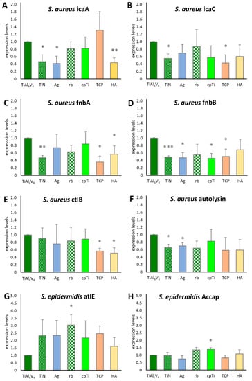 Expression levels of biofilm-associated genes for S. aureus (A–F) and S. epidermidis (G,H). Statistically significant differences between the base material TiAl6V4 and the surface modification types are marked as * (p < 0.05), ** (p < 0.01) and *** (p < 0.001).