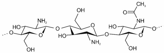 Among the above polymers, chitosan (Figure 1), a polysaccharide resulting from the alkaline deacetylation of chitin, is a particularly promising material for scaffolds. This biopolymer exhibits many unique biological, physiological, and pharmacological properties: nontoxicity, biocompatibility with living tissues and biodegradability. The bioactivity of chitosan is also noteworthy, including acceleration of the wound healing process, increased immunity, hemostatic activity, induction of a biological response, bactericidal and fungicidal activity [25,26,27,28].