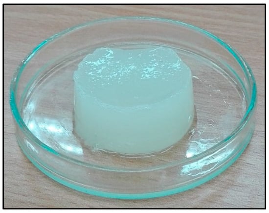 Thermosensitive chitosan hydrogels were prepared by physical blending. Firstly, CH (0.4 g) was dissolved in 16 mL LA or HCL (0.1 mol/L). The solutions were stirred (at slow rotations) until complete dissolution and left at room temperature for 24 h. Then, solutions of the crosslinking agents (2 g β-GP was dissolved in 2 mL deionized water at 4 °C, while 2 g UMP was dissolved in 2.5 mL deionized water at 4 °C) were added drop by drop into the chitosan salts solutions. Each sample was mixed for 20 min and stored at 4 °C for about 1 h. The prepared formulations were homogeneous solutions, which were subsequently incubated at 37 °C to complete their gelation. Due to the fact that the obtained hydrogels looked the same, only a photograph of the CH/LA/UMP system is shown in Figure 4.