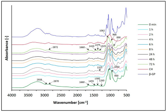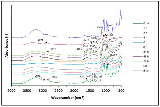 Analyzing the frequency range of 1680–1500 cm−1, it is possible to observe characteristic peaks of CH, corresponding to the C=O bond in amide group (amide I vibration) and the amide II band coming from NH2, which indicate that this polymer is a partially deacetylated product of chitin. The spectra of the CH/LA/β-GP system (0 min) and hydrogels after conditioning in water for less than 8 h show one distinct band of 1600 cm−1 with a minor shoulder. Biomaterials conditioned in water for above 8 h have two bands at 1656 and 1582 cm−1. On the other hand, in the case of the CH/HCL/β-GP systems (before and after conditioning in water), no significant changes are observed.