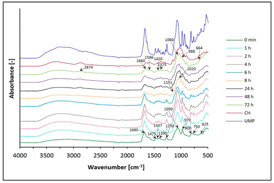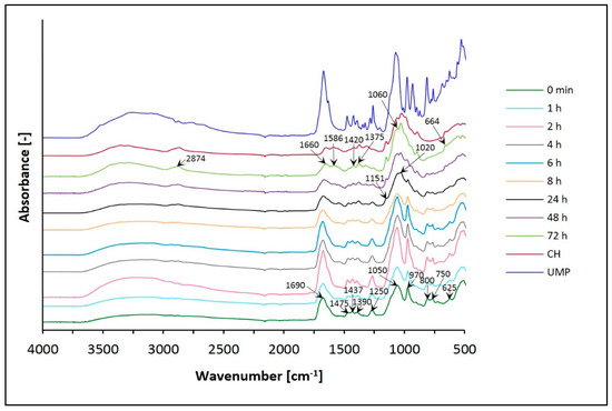 In turn, the bands at 800 and 750 cm−1 are clearly visible up to a defined time (24 h) and then they disappear leaving trace amounts. The peak at 625 cm−1, in the spectra of the CH/LA/UMP and the CH/HCL/UMP systems, moves towards a higher wavenumber (664 cm−1).