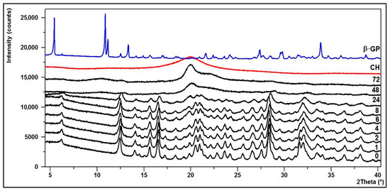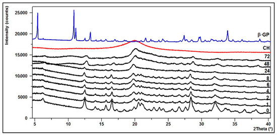 XRD diffraction patterns of the CH/LA/β-GP system conditioned in water.