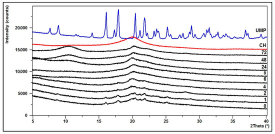 XRD diffraction patterns of the CH/LA/UMP system conditioned in water.
