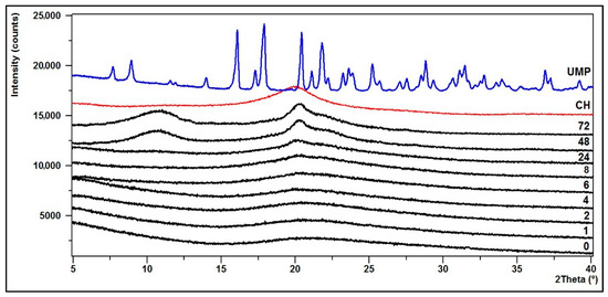 On the other hand, the diffractogram for the CH/HCL/UMP system (0 min) shows that the biomaterial is practically amorphous. From 24 h of conditioning in water, the structure of the hydrogel returns to pure polymer and from 48 h, two typical peaks at angles of 2θ ≈ 11 and 20° are noticeable.