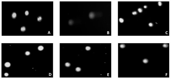 Representative images (200 × magnification) of the comet assay in HT-29 cells after 48 h of exposure: (A) negative control, (B) positive control, (C) CH/LA/β-GP treated, (D) CH/HCL/β-GP treated, (E) CH/LA/UMP treated, (F) CH/HCL/UMP treated.